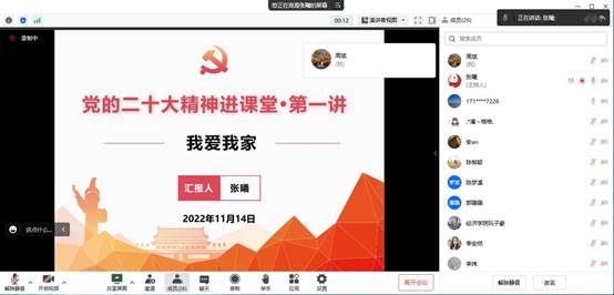 为推动党的二十大精神进教材、进课堂、进头脑,真正把学习贯彻党的二十大精神的具体成效转化为工作实效,促进教师将党建与教学融合,落实好立德树人根本任务。11月22日下午,公司教师党支部组织开展“教师工作坊系列之一:党的二十大精神进课堂”主题党日活动,会议由党支部书记周斌主持,教师党支部全体党员参加。本次活动采取线上与线下结合方式。