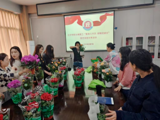 随后,分工会女工委员吕倩老师进行现场演示,逐步介绍盆栽花卉种植养护的操作技巧,带领女教职工全面深入的掌握盆栽花卉的种植养护技术。经过近1个小时的努力,大家亲手栽种修缮了属于自己的乒乓球菊、萝卜海棠等盆栽花卉。职工们纷纷与自己精心制作的盆栽作品进行合影留念,都收获了一份属于自己的“女神节礼物”。绿植栽种结束后,大家就花艺种植和培育进行了探讨和交流,现场气氛热烈。