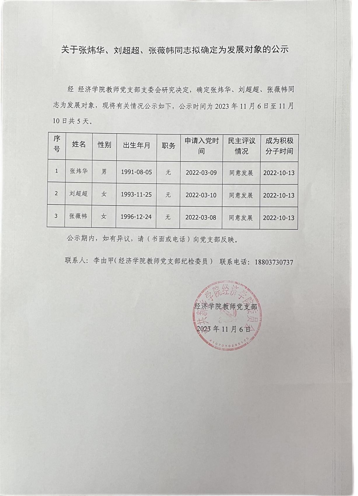 关于张炜华、刘超超、张薇帏同志拟确定为发展对象的公示