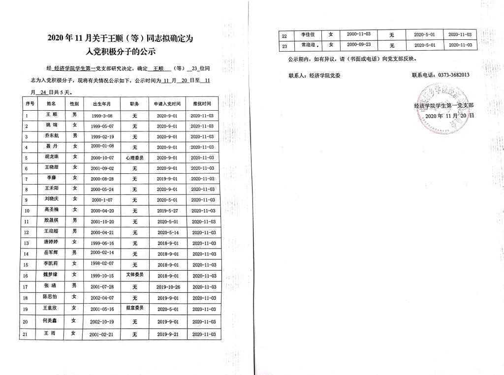 2020年11月关于王顺(等)同志拟确定为入党积极分子的公示