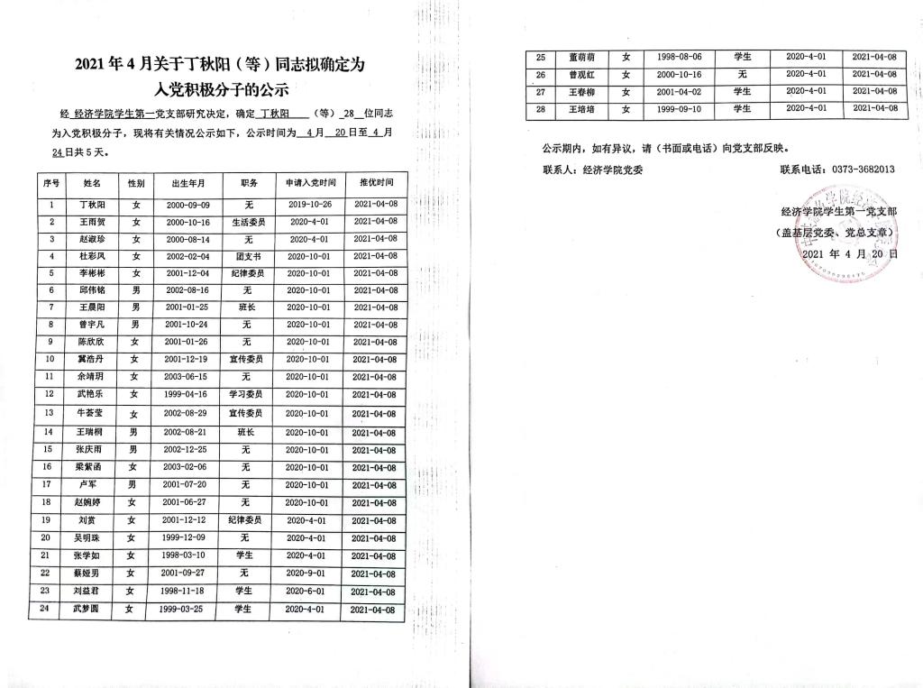 2021年4月关于丁秋阳(等)同志拟确定为入党积极分子的公示