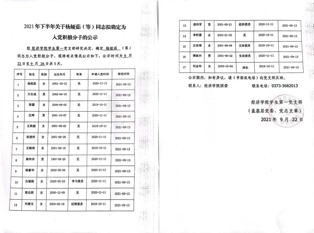 2021年下半年关于杨娅茹(等)同志拟确定为入党积极分子的公示