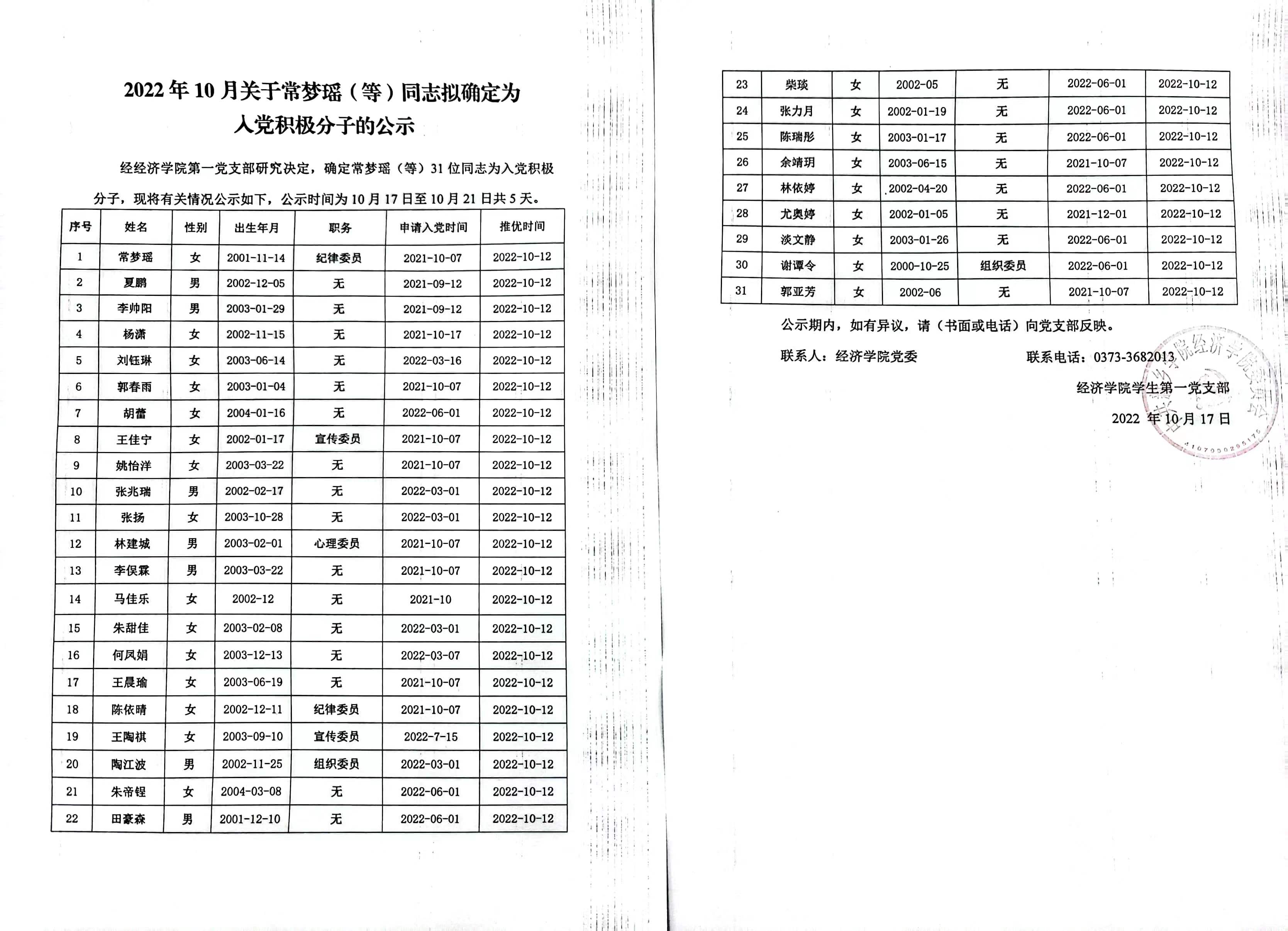 2022年10月关于常梦瑶(等)同志拟确定为入党积极分子的公示