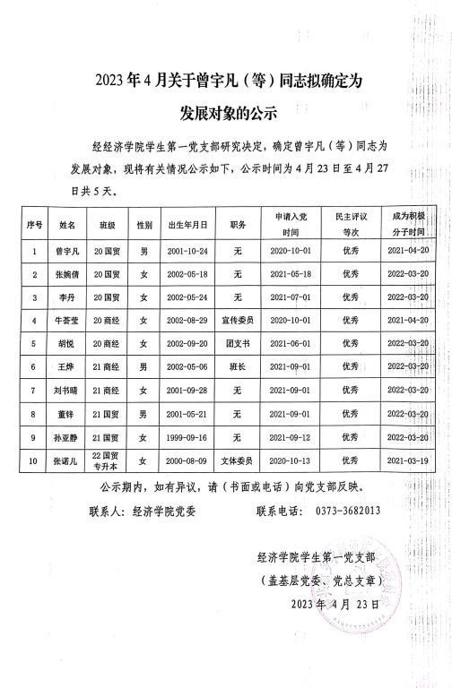 2023年4月关于曾宇凡(等)同志拟确定为发展对象的公示