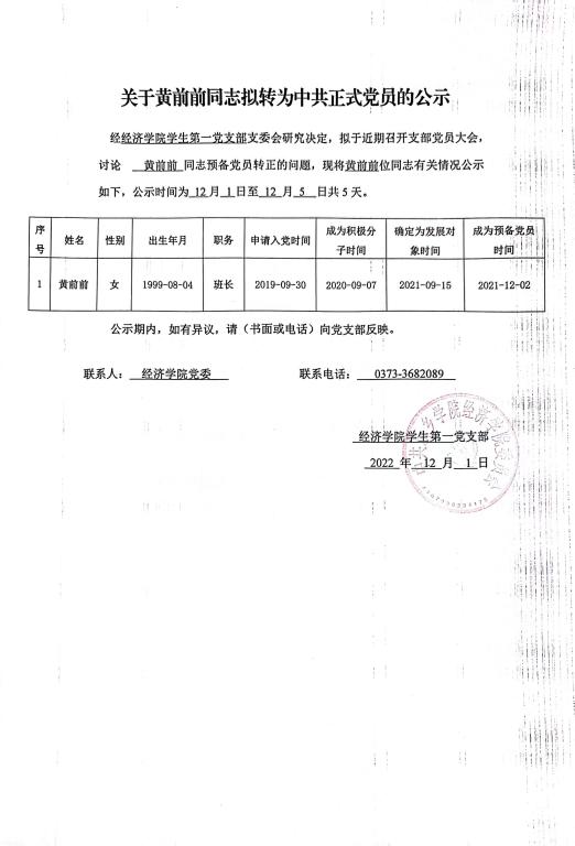 关于黄前前同志拟转为中共正式党员的公示