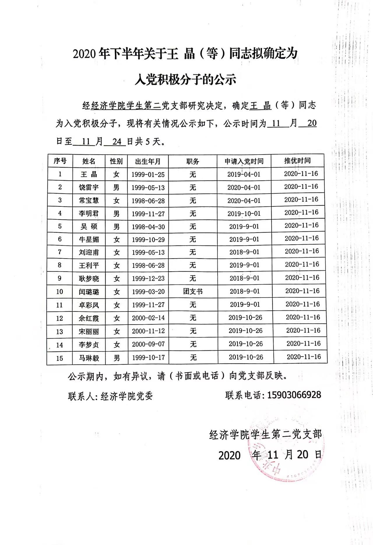 2020年下半年关于王晶(等)同志拟确定为入党积极分子的公示