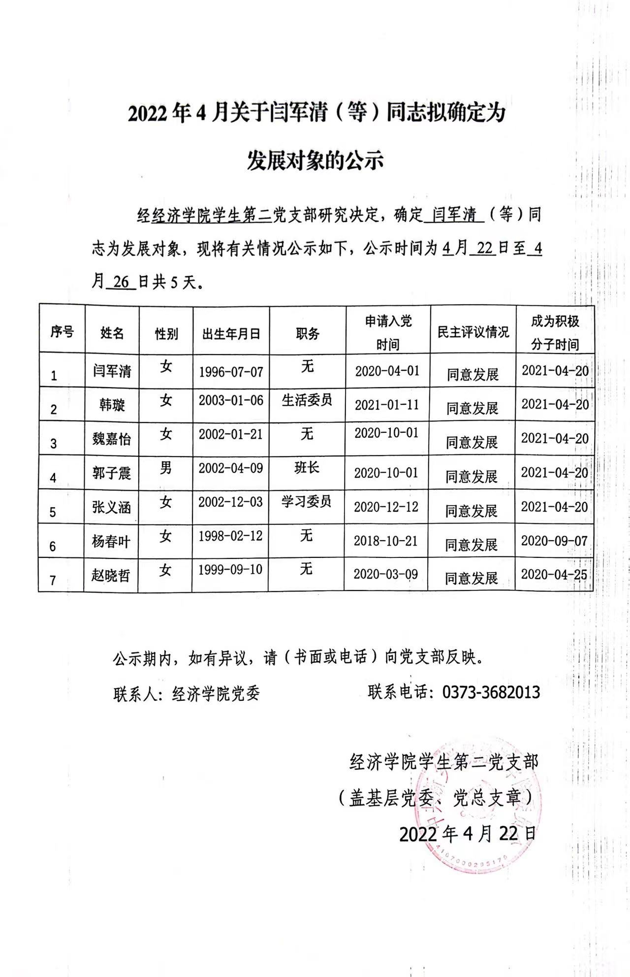 2022年4月关于闫军清(等)同志拟确定为发展对象的公示