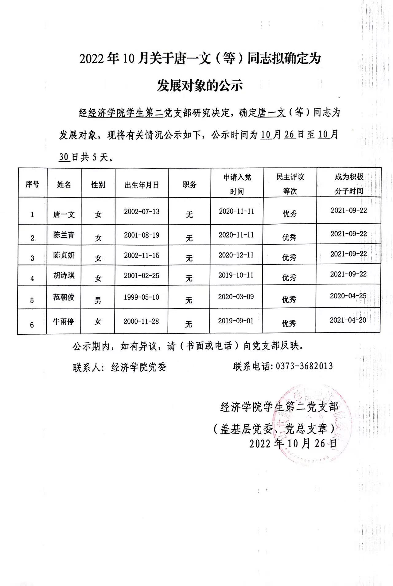 2022 年10月关于唐一文(等)同志拟确定为发展对象的公示