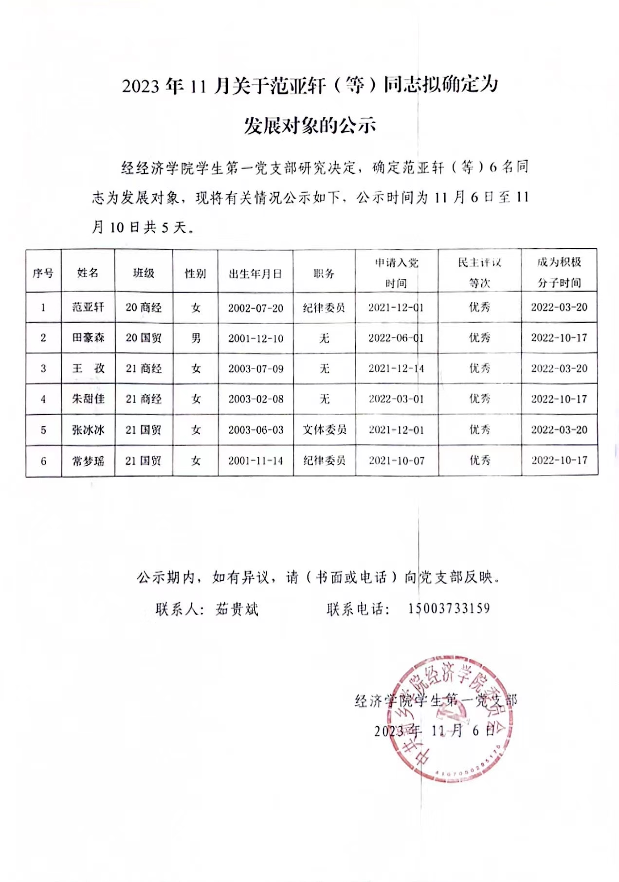 2023年11月关于范亚轩(等)同志拟确定为发展对象的公示