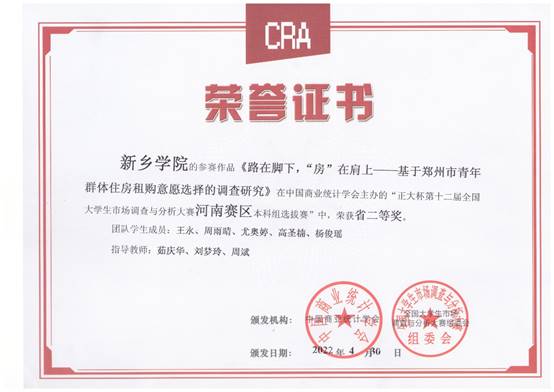 茹庆华老师团队参赛作品《路在脚下,“房”在肩上——基于郑州市青年群体住房租购意愿选择的调查研究》获得省赛二等奖。