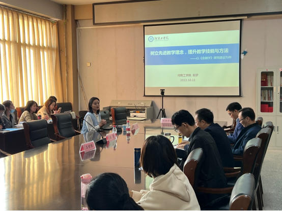 赵梦老师是河南省本科高校教师课堂教学创新大赛特等奖获得者,她以“树立先进教学理念,提升教学技能与方法——以《金融学》课程建设为例”为报告题目,介绍了其在课程建设中的一些经验和做法,以及青年教师课堂教学创新大赛的情况。赵梦老师提到,首先课程是人才培养的核心要素,教学改革改到深处就是课程。课程是落实“立德树人成效”根本标准的具体化、操作化,是体现“以员工发展为中心”理念的最后一公里。其次要树立先进的教学理念,坚持立德树人,体现以员工发展为中心,致力于开启员工内在潜力和学习动力,注重员工德智体美劳全面发展。最后要注重提升教学技能与手段,把做游戏的思想和课程思政有机融入课堂,使用好超星学习系统和雨课堂等平台,把过程性考核落到实处。