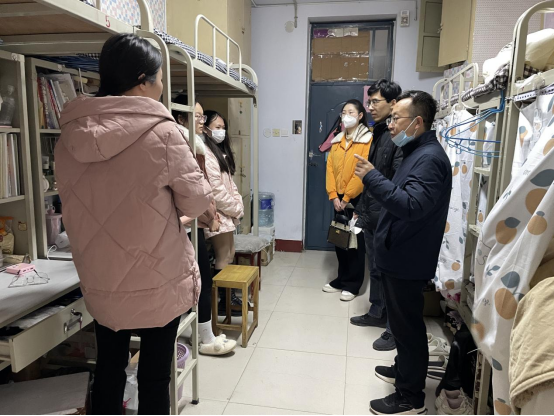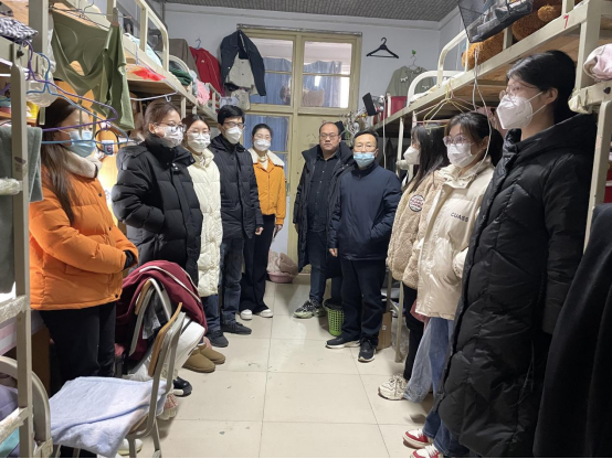 凛冽的寒风挡不住关怀的脚步,天气的严寒冷却不了一颗温暖的心。新学期伊始,正值beats365中文官网员工返校之时。2月12日当天,beats365中文官网经理赵国喜、党委副书记陈卓、学工办主任茹贵斌、分团委书记陈柳颖、辅导员阮子豪、郭璐璐、张薇帏、刘超超、张炜华分批次深入员工宿舍,看望返校员工,了解疫情后员工心理与健康情况,做好开学各项安全注意事项提醒工作。