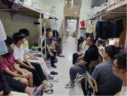 各辅导员老师与员工们进行了交流,详细的了解了他们的身体状况、心理状态与日常生活情况,针对性给予指导性建议和意见,同新生细致解答了宿舍的空调租赁和使用、银行卡办理、洗浴充值等问题,排查了员工宿舍安全隐患风险点,帮助新生尽快了解新环境。建议同学们调整好入学状态,以饱满的精神,参加接下来为期两周的军训与入学教育。