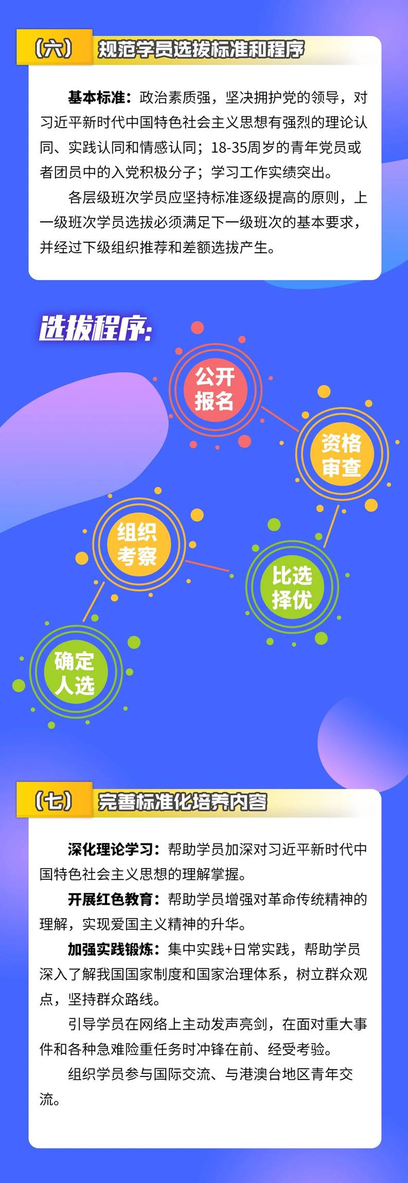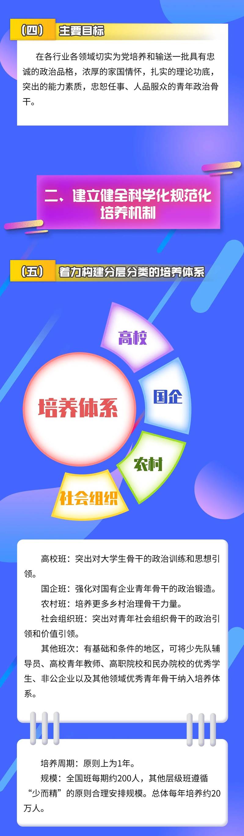 《意见》提出,要逐步构建覆盖高校、国企、农村、社会组织等各领域优秀青年的分层分类培养体系,每年全国及以下各层级培养规模约为20万人;要规范学员选拔标准和程序,从坚决拥护党的领导,对习近平新时代中国特色社会主义思想有强烈的理论认同、实践认同和情感认同,学习工作实绩突出的优秀青年中选拔学员,按照公开报名、资格审查、比选择优、组织考察、确定人选等程序进行选拔;要完善标准化培养内容,通过深化理论学习、开展红色教育、加强实践锻炼等突出学员综合素质特别是政治素质的锤炼提升;要建立健全从严管理机制,通过健全日常管理机制、完善考核评价机制、严格淘汰退出机制、建立跟踪培养机制等加强对学员的管理;要突出为党培养和输送青年政治骨干的功能定位,大力加强人才举荐,做好学员推优入党工作,推动高校班优秀学员依程序进入选调生队伍,推动国企班优秀学员进入企业优秀人才队伍,推动农村班优秀学员进入村“两委”班子,加强对社会组织班优秀学员的举荐和组织吸纳等。