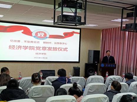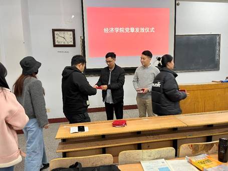 其次由公司党委成员、教师党员和员工党员向班级每一位同学发放党章并介绍入党流程。