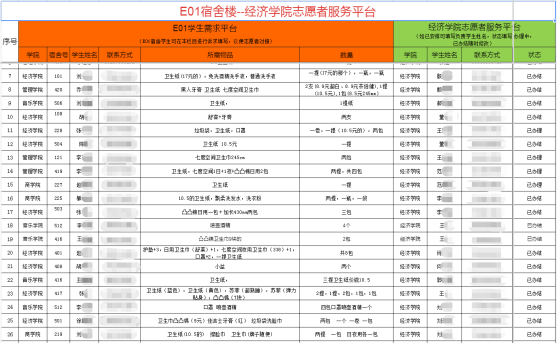 志愿服务队首先建立了E01宿舍楼志愿服务平台,发挥宿舍长的沟通桥梁作用,制作志愿服务共享表格,畅通员工诉求渠道,从而切实了解了员工现阶段的急难愁盼。其次,志愿服务队成员考察了东区超市现有的生活必需品和防疫物品,分门别类,拍照留存,以便宿舍内员工进行采购物品的选择。随后,按照公司现阶段宿舍管理要求,志愿者对服务队成员“包干到户”,划定采购值班时间。