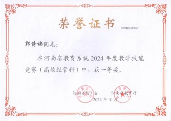 近日,河南省总工会和河南省教育厅联合下发了《关于河南省教育系统2024年度教学技能竞赛获奖情况的通报》(豫工文[2024 ]89号),表彰了2024年度全省教育系统教学技能竞赛中获奖的单位和个人,其中,公司教师郭倚楠荣获一等奖。