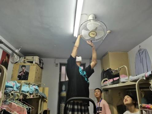 党员们分为三个小组有序进入院系员工宿舍楼。清扫风扇、灯棒、蜘蛛网等卫生死角,为确保电闸处于关闭状态,检查完地面湿滑情况后,撑开梯子,一人扶梯,一人在梯子上清理风扇、灯棒、屋顶的灰尘,一人负责递水和抹布,清理完毕后,有序离开员工宿舍。整个活动过程中党员和员工会工作人员都严格遵守纪律,不影响同学们正常的学习和休息,配合好公司疫情防控工作,受到了寝管老师和同学们的称赞。