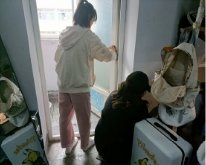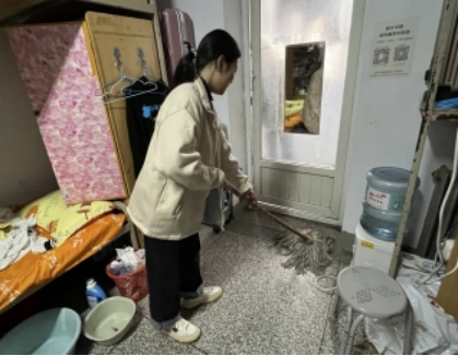 权益维护部成员首先对寝室进行安全检查,同时部长柴琰、王雨蓉与宿舍同学进行交流,询问大家在生活中遇到的困难和问题,并了解到同学们的看法和建议。其次,部门成员分组帮助宿舍同学清扫死角灰尘,擦拭门窗,扫拖地面,清扫完毕后,有序离开员工宿舍。整个过程中部门成员都严格遵守纪律,不影响同学们的正常学习与生活。