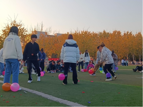 最后一项拓展活动叫“踩气球”。游戏中男生最初占据上风,但女生也巾帼不让须眉,找准机会“快、准、狠”地踩炸了男生的气球,逆风翻盘,取得胜利。