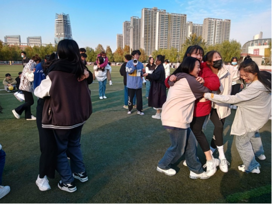 第三个拓展活动是“喊数抱团”,当主持人喊出一个数字,同学们应立即按主持人所喊的数字聚集成为一个团体。大家都跃跃欲试,随机而动,在听到数字后和原本陌生的同学聚集在一起,其乐融融。